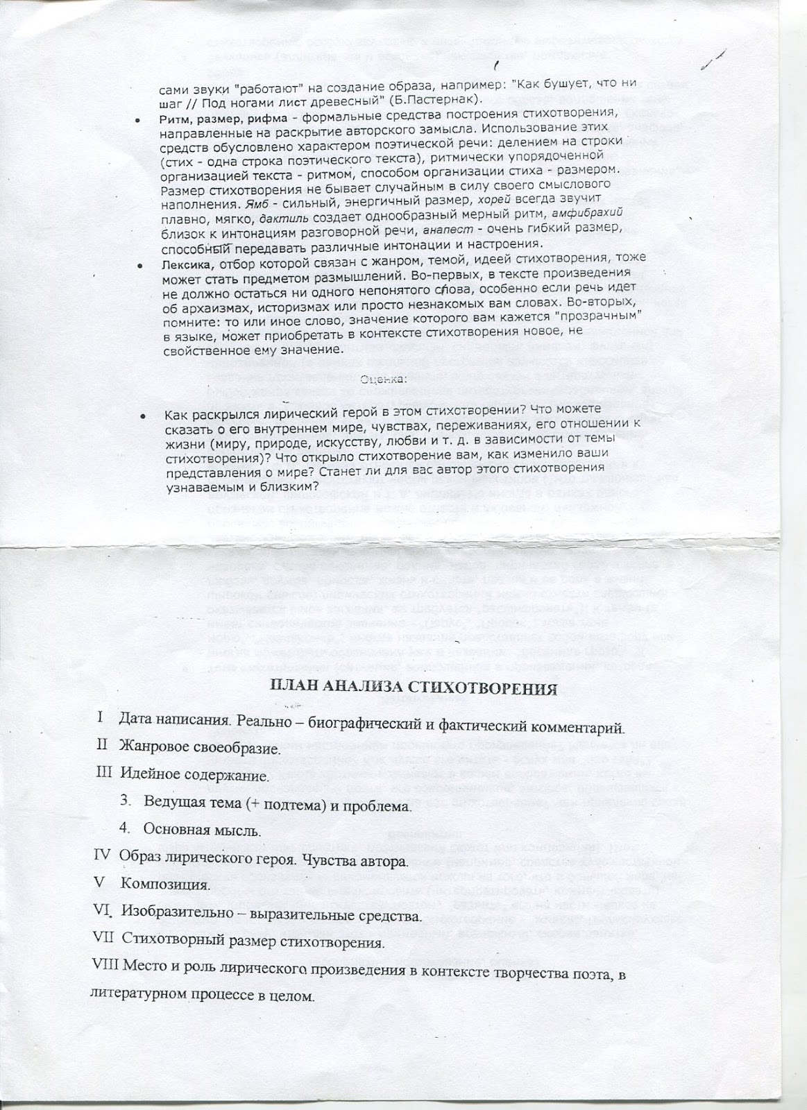 Так как мы начали блок поэзии, то план анализа поэтического текста будет весьма полезен. Выкладываю по этому поводу скан дельной бумажки (там два плана: длинный и короткий, на практике применяйте короткий)